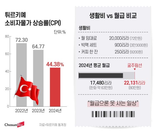 터키 인플레이션(CPI)은 2022년 72.3 %, 2023년 64.8 %, 2024년 44.4 %로 여전히 고공행진입니다. 스타벅스 아메리카노가 250리라(≈9,200원)까지 치솟으며 ‘월급으로는 못 사는 일상’이 현실화되고 있죠. 터키 인플레이션을 거울삼아 우리도 통화가치, 정책 신뢰, 자산 착시 위험을 반드시 점검해야 합니다.