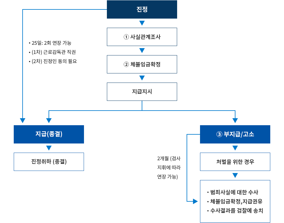 ② 근로감독관의 조사로 임금체불 등 법 위반 사실이 확인되는 경우 사업주에게 시정지시 → 법 위반이 시정되면 사건을 종결
